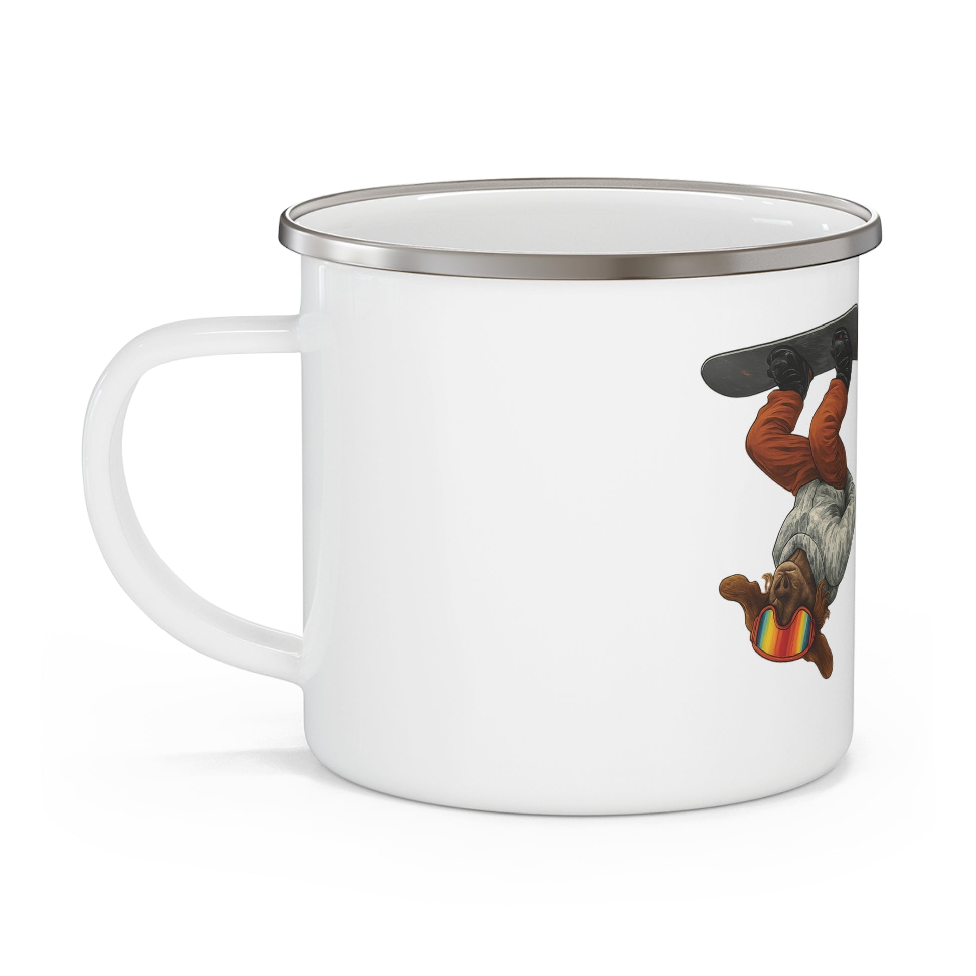This enamel camping mug is designed for snowboarders but can be enjoyed by all. Featuring a dog performing a tame dog snowboard trick, it's perfect for ski touring, hiking, camping, or enjoying coffee and tea at home. It gives off a cool, adventurous vibe and is relevant for outdoor enthusiasts, snowboarders, and anyone who loves unique mugs. Great for winter holidays, camping trips, and everyday use.